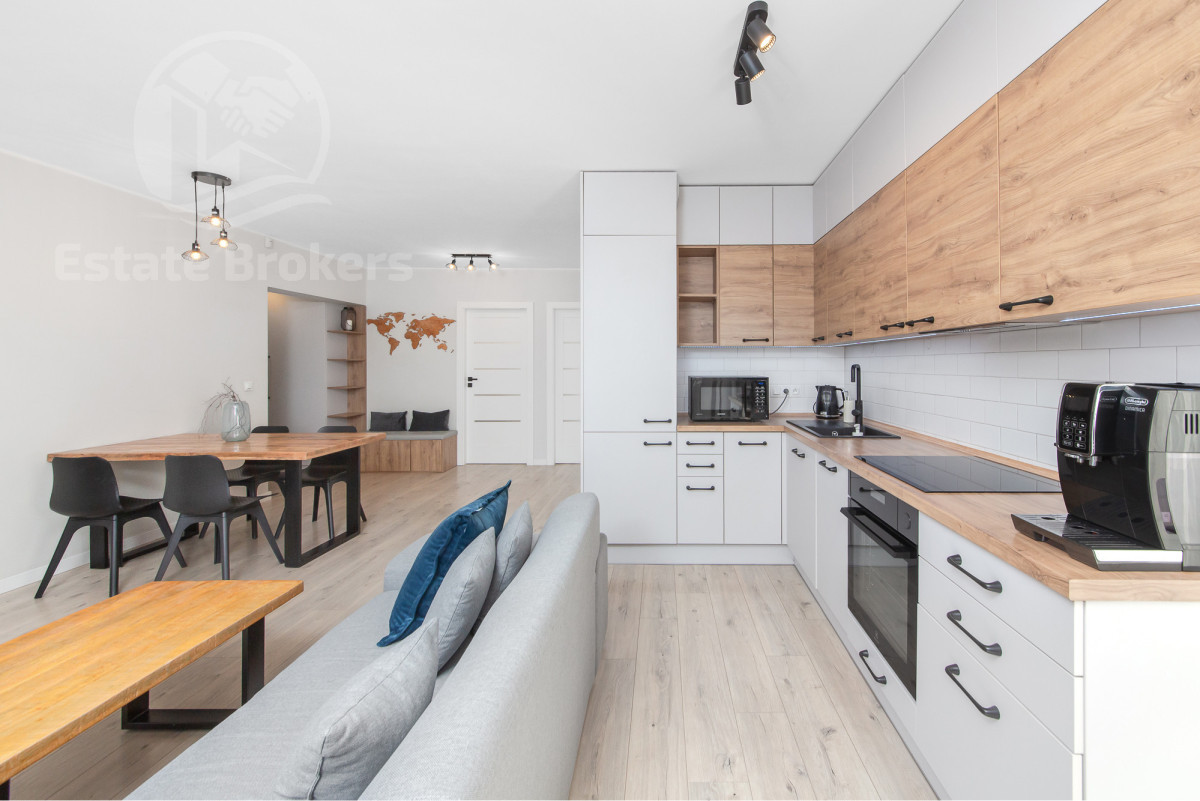 Kuchnia w pełni wyposażona: piekarnik parowy SteamCrisp, płyta indukcyjna zintegrowana z okapem, lodówka Liebherr, zmywarka Bosch, pralko-suszarka, ekspres do kawy. Apartament gotowy do zamieszkania — bez doposażania.