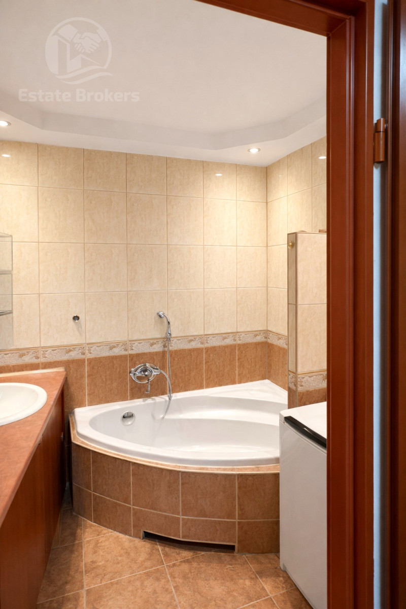 Meble: dwa łóżka, rozkładana kanapa, komoda, szafa w zabudowie, stół jadalniany z krzesłami, zasłony i firany, wanna
