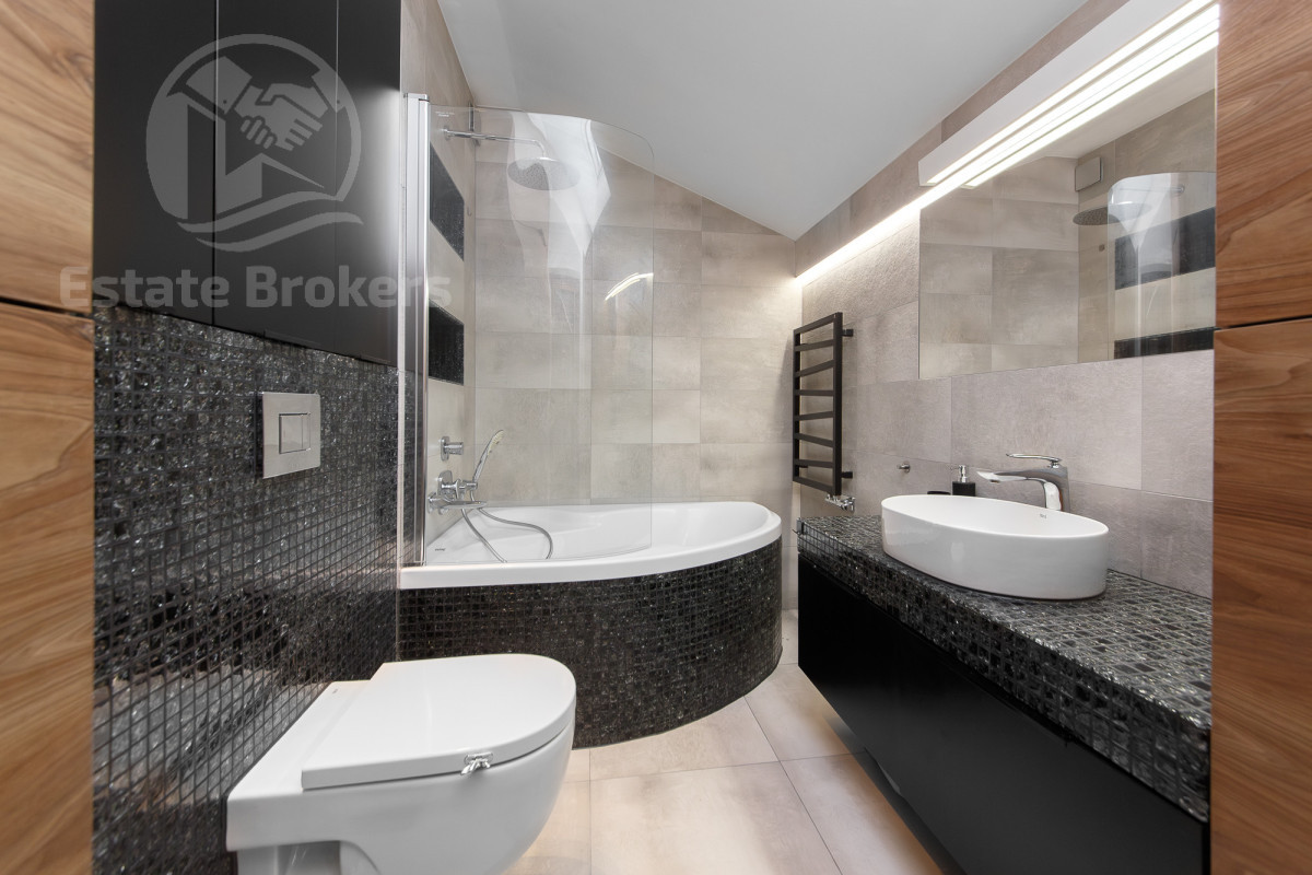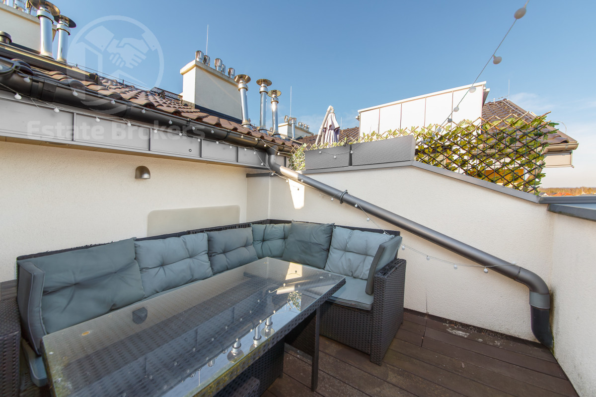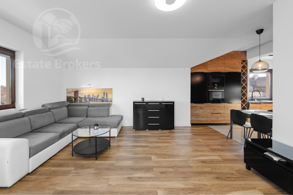 Salon - przestronny i jasny, idealne miejsce do relaksu. Kuchnia - w pełni wyposażona, duża lodówka, zmywarka, piekarnik, płyta grzewcza, a także okno w kuchni, które zapewnia lepszą wentylację i doświetlenie. Łazienka - nowoczesna, z oknem w suficie, co zapewnia naturalne światło i lepszą wentylację. Taras - duża przestrzeń na świeżym powietrzu, idealna do wypoczynku. Dodatkowe udogodnienia: