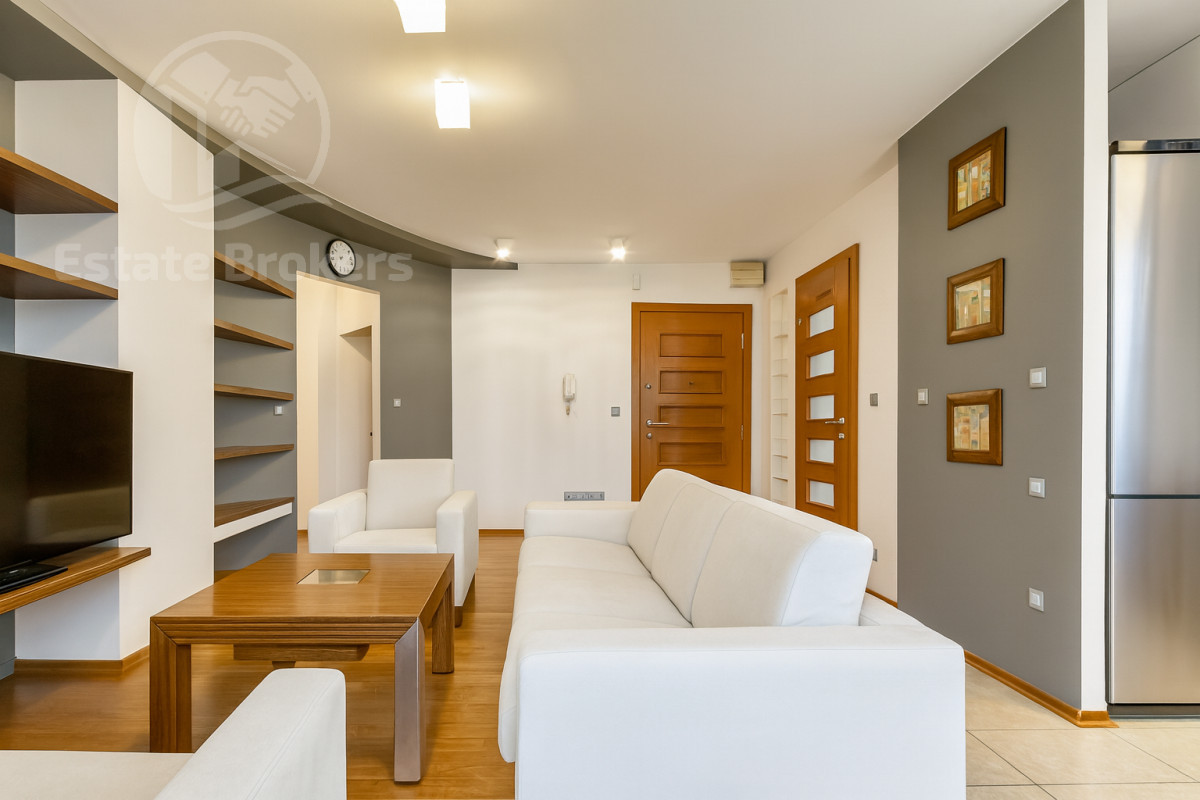 - Jasny salon z aneksem kuchennym oraz wyjściem na balkon