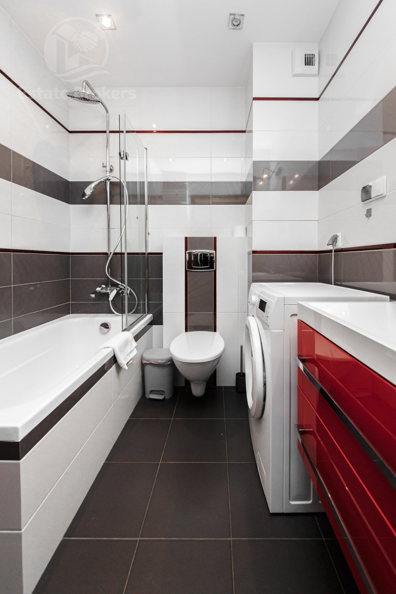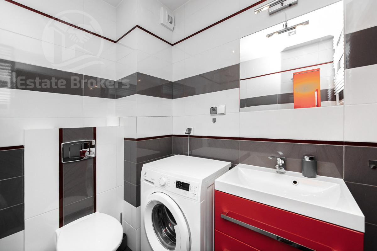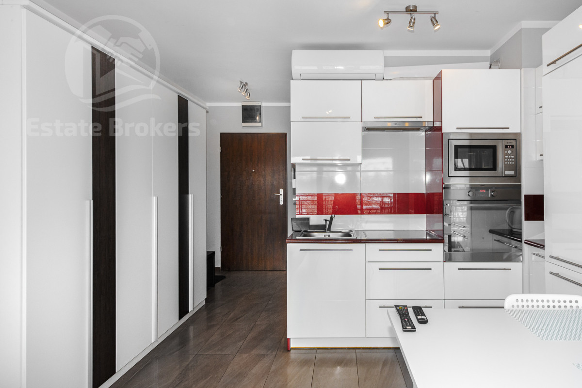 W lokalu znajduje się aneks kuchenny z lodówką, piekarnikiem oraz mikrofalą. Część dzienna wyposażona jest w rozkładaną kanapę, a także dużą szafę w zabudowie, zapewniającą dużo miejsca do przechowywania. W łazience jest pralka.