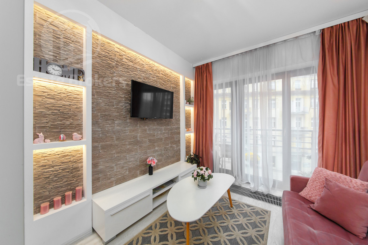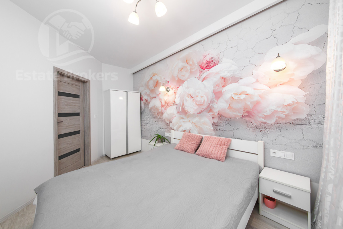 Stylowy salon z oświetleniem LED, ścianą wyłożoną eleganckim kamieniem dekoracyjnym oraz telewizorem zamontowanym na ścianie. Przytulna sypialnia z romantycznym motywem kwiatowym na ścianie, tworząca wyjątkową atmosferę relaksu. Jasna kuchnia z nowoczesnymi meblami w zabudowie oraz pełnym wyposażeniem AGD Łazienka urządzona w minimalistycznym stylu, z wysokiej jakości armaturą. Przestronny przedpokój z szafą w zabudowie, zapewniającą dużo miejsca na przechowywanie. Dodatkowe atuty