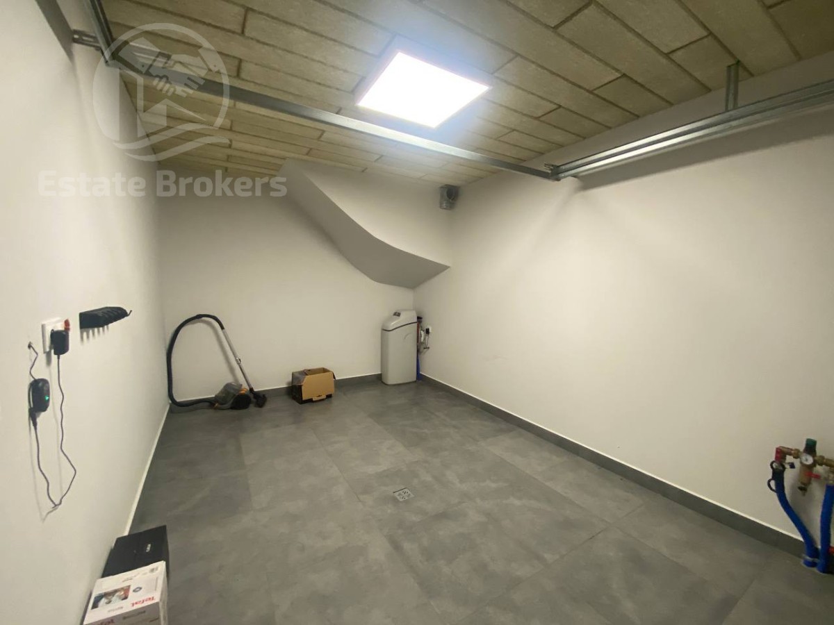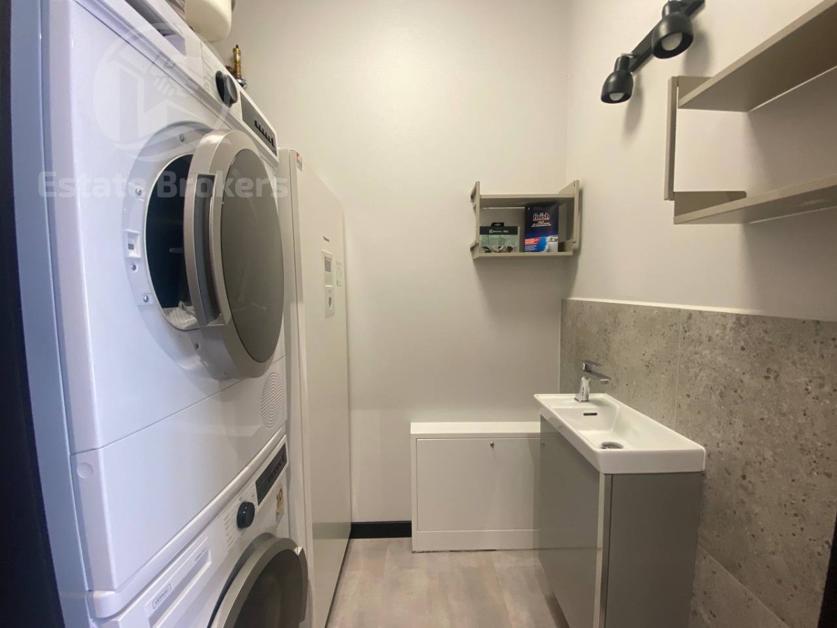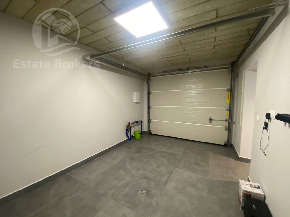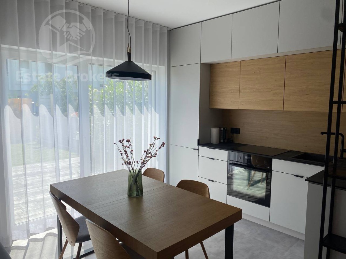 Przedpokój Salon z aneksem kuchennym (pełne AGD, meble na wymiar) Toaleta Pralnia (pralka + suszarka) Garaż w bryle budynku + dodatkowe miejsce postojowe Ogród 60 m² z tarasem i meblami ogrodowymi Piętro: