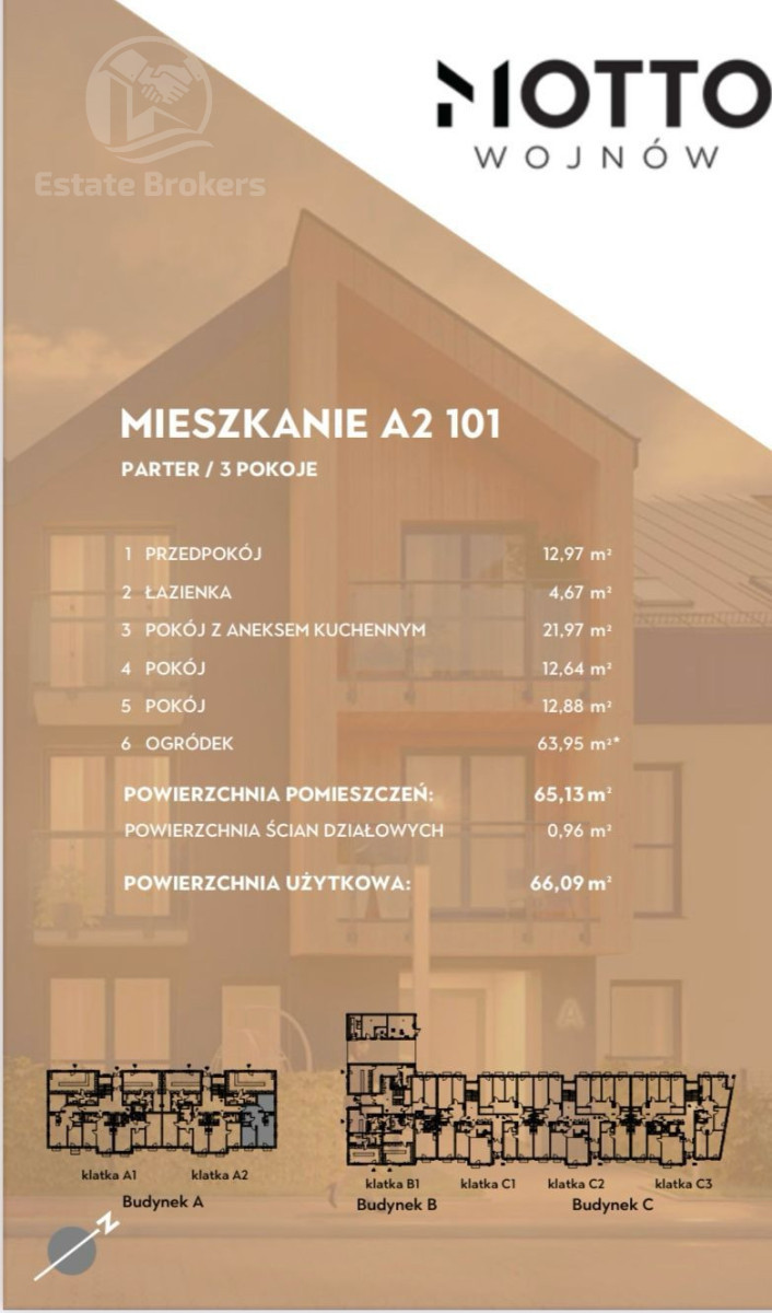 powierzchnia 65,13 m² - idealny układ dla rodziny, duży ogródek - prywatna przestrzeń do relaksu, miejsce parkingowe za 20 000 zł, stan deweloperski - możliwość własnej aranżacji, brak podatku PCC, zielona i spokojna okolica, nowoczesny budynek o wysokim standardzie. Idealna propozycja dla osób, które szukają nowoczesnego i komfortowego mieszkania z prywatną przestrzenią na świeżym powietrzu, w cichej części miasta, a jednocześnie z dobrym dojazdem do centrum.
